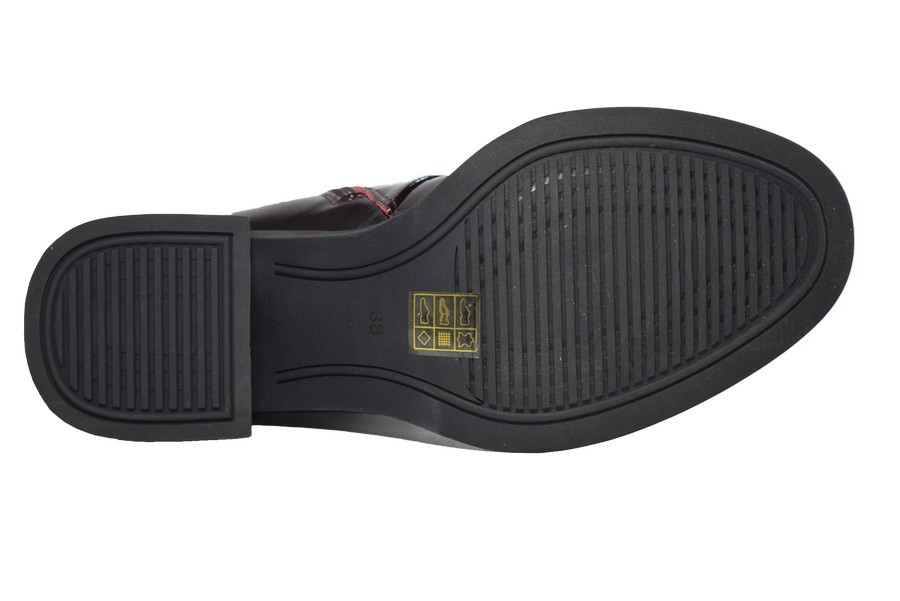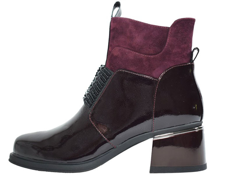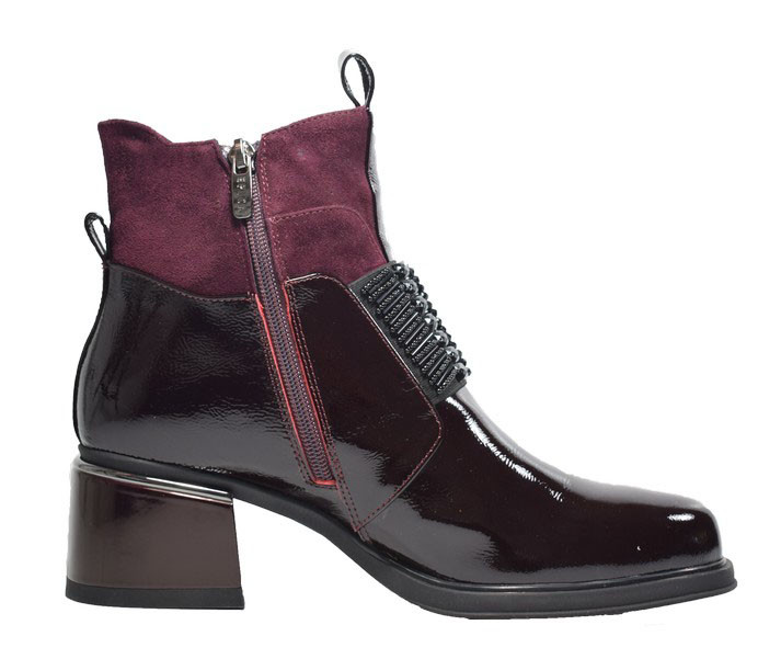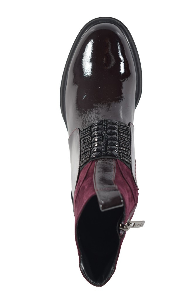 Divatos, extravagáns női bőrlakk bokacsizma belső oldalán cipzárral, magas blokk sarokkal
