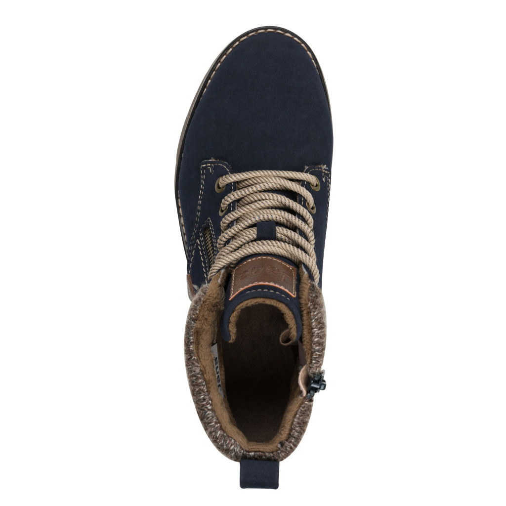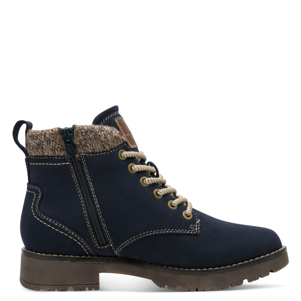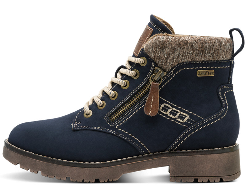 Kényelmes, divatos, fűzős, vízálló női bokacipő, belső oldalán cipzárral, széles bőségben, textil gallérral.