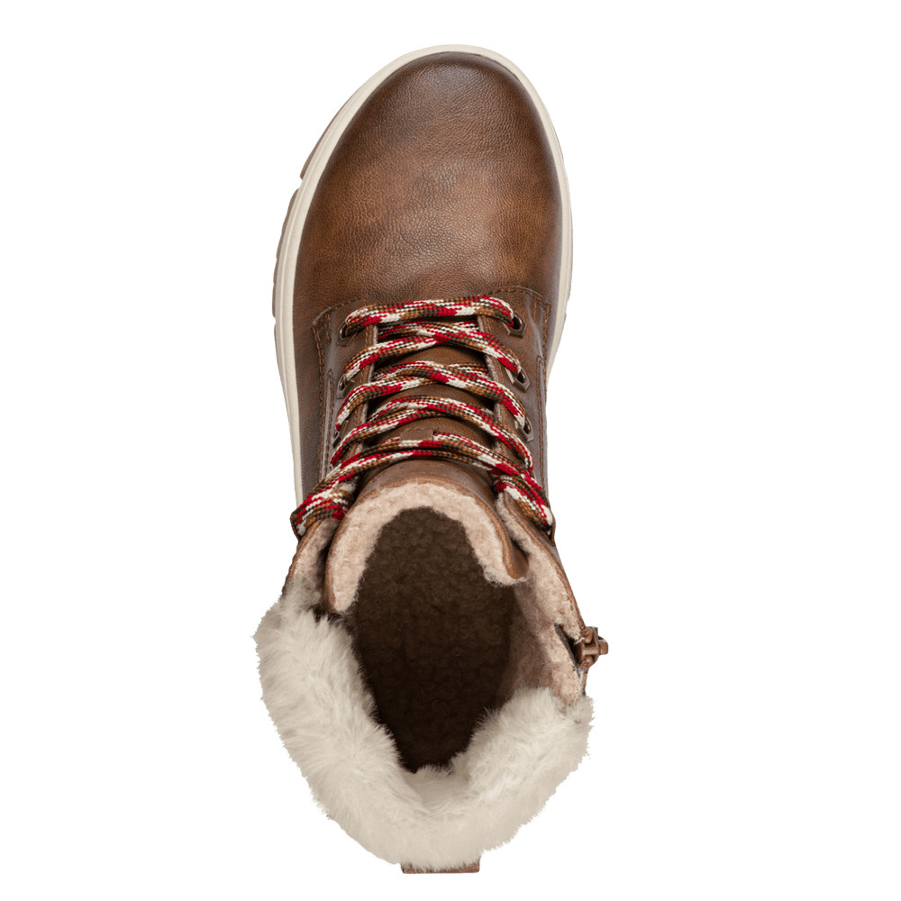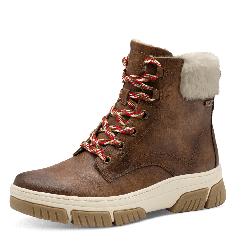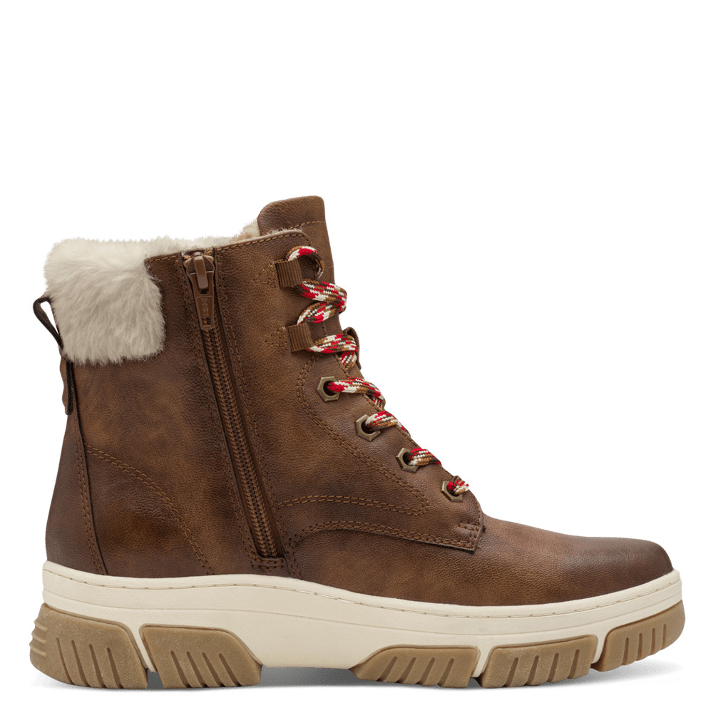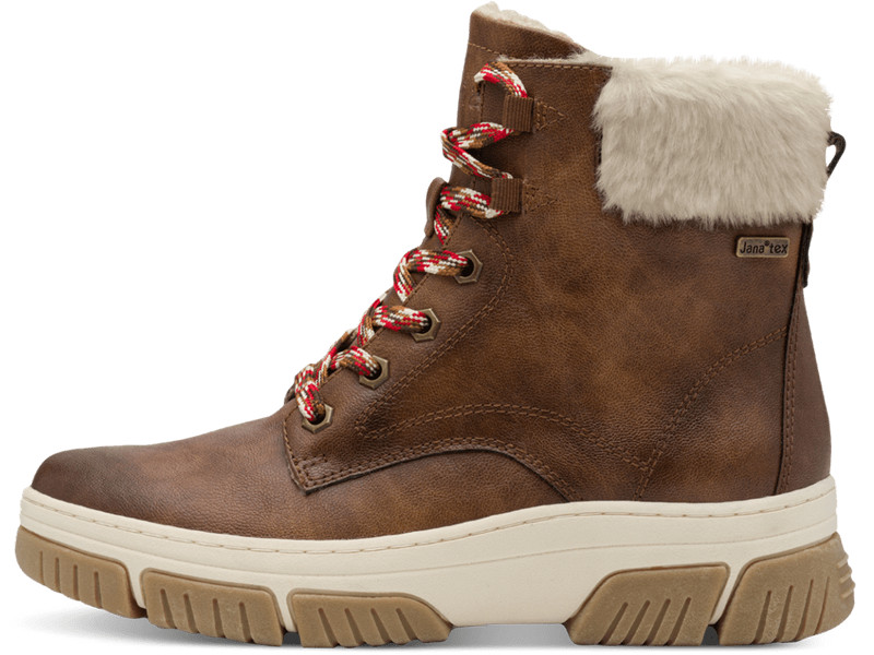 Divatos, kényelmes, vízálló, fűzős női bakancs belső oldalán cipzárral, széles bőségben, szőrme gallérral