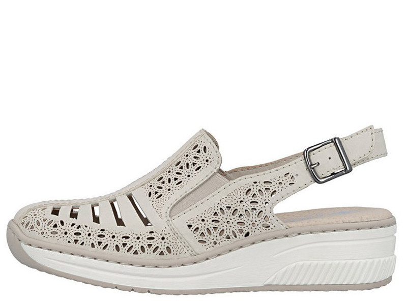 Kényelmes, divatos, csatos, elől zárt, hátul nyitott női szandál. Modell: Rieker 48763 60 Szín: beige / bézs Felsőrész: természetes nappabőr Bélés: szintetikus soft nappa - természetes bőr Kaptafaszélesség: G - kényelmi normál bőség Sarokmagasság: 4 cm