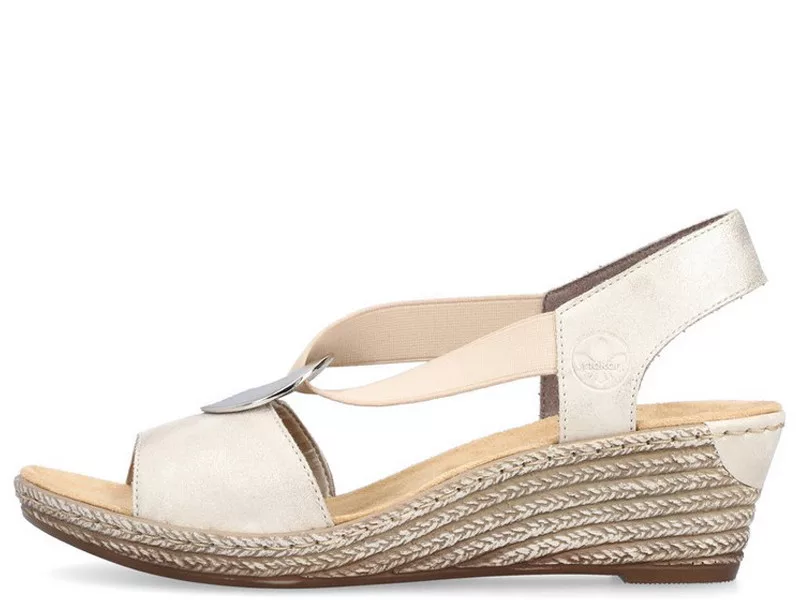 Kényelmes, divatos, bebújós, női szandál. Modell: Rieker 624H6 60 Szín: beige / bézs Felsőrész: szintetikus soft nappa Bélés: textil - szintetikus soft nappa Kaptafaszélesség: G - kényelmi normál bőség Sarokmagasság: 5 cm