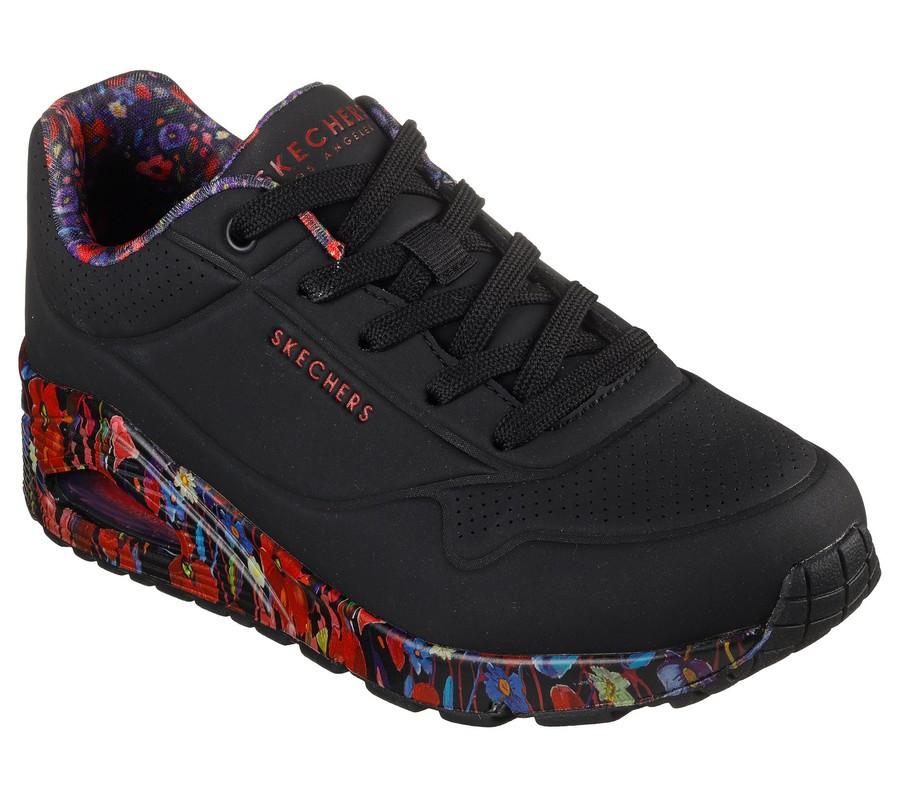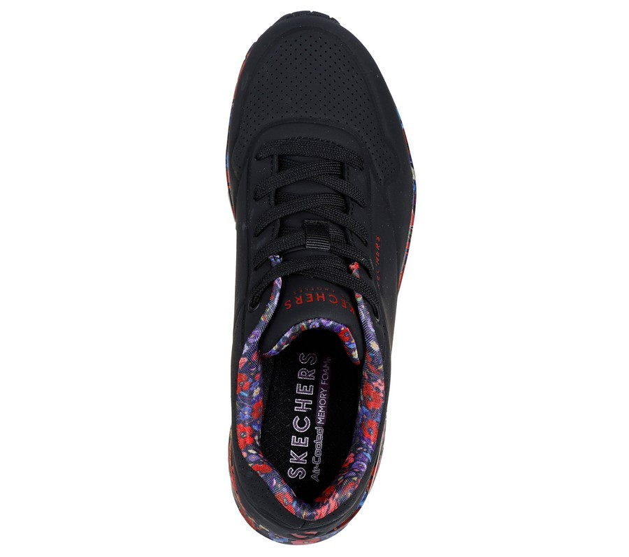 Skechers Street Uno - Majestic Garden. Ez a fűzős divatos sportcipő szintetikus durabuck felsőrésszel, virágmintás szegéllyel, Skechers Air-Cooled Memory Foam talpbetéttel és látható Skech-Air középtalppal készült.