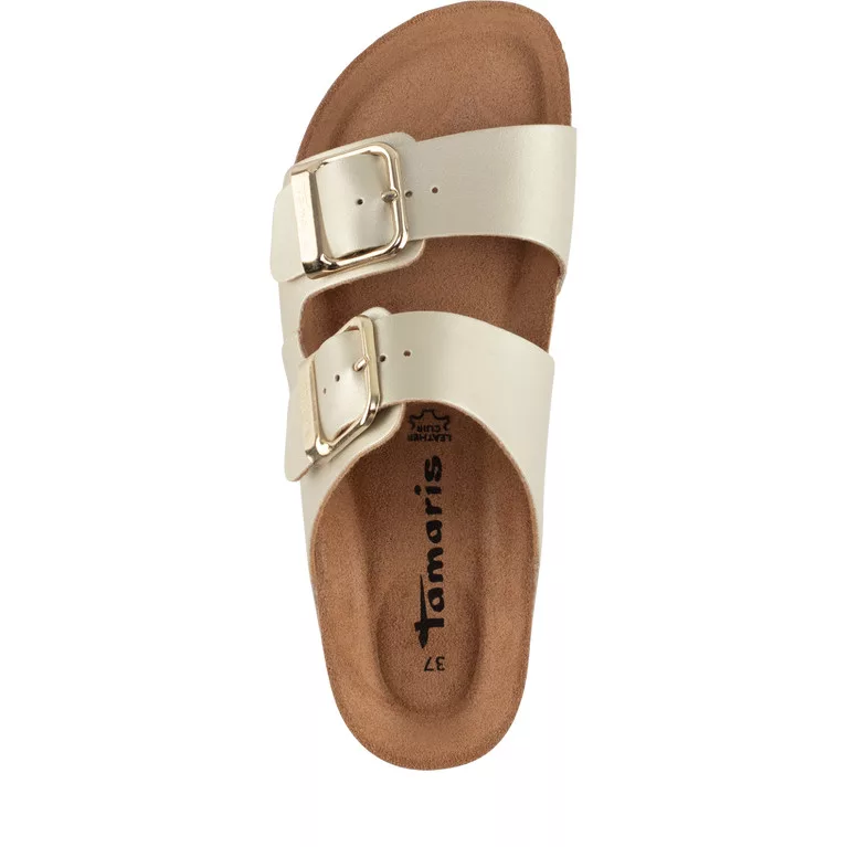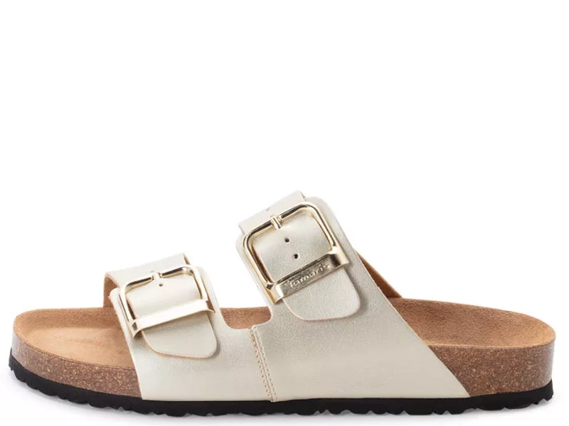 Divatos, kényelmes, csatos női komfort papucs. Modell: Tamaris 27503 42933 Szín: light gold / világos arany Felsőrész: szintetikus soft nappa Bélés: textil - természetes bőr Kaptafaszélesség: G - kényelmi normál bőség Sarokmagasság: 3 cm