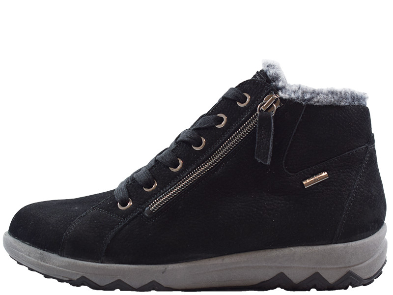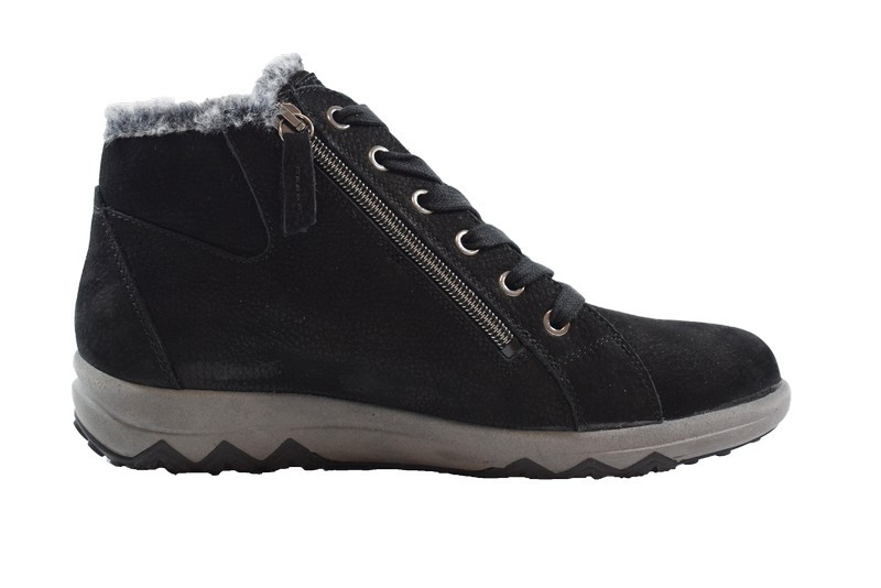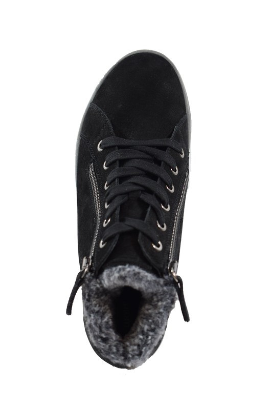 Kényelmes, vízálló, fűzős női bokacipő, külső és belső oldalán cipzárral, széles bőségben, szőrme gallérral.